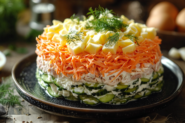 2. Выкладывайте салат слоями: курица, майонез, огурцы, майонез, морковь, майонез, яйца, майонез, сыр. Дайте салату пропитаться в холодильнике 1–2 часа перед подачей. Приятного аппетита!