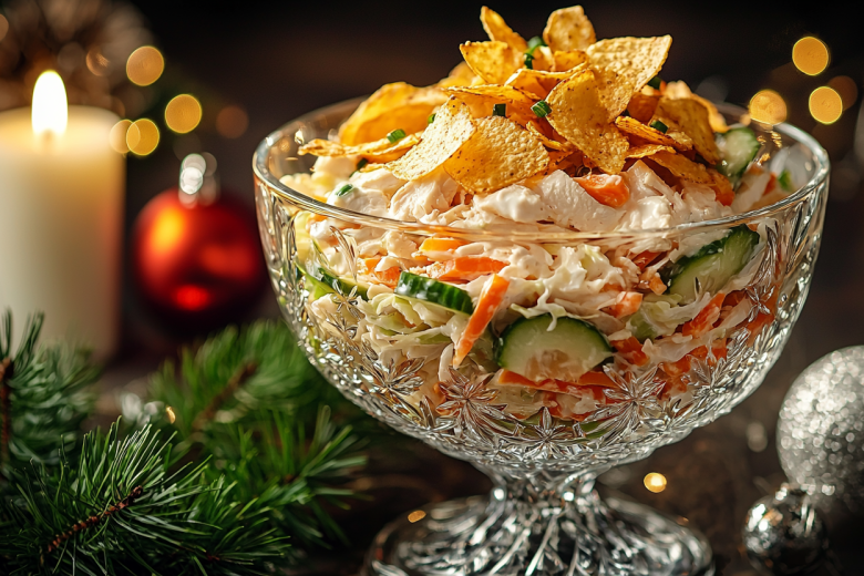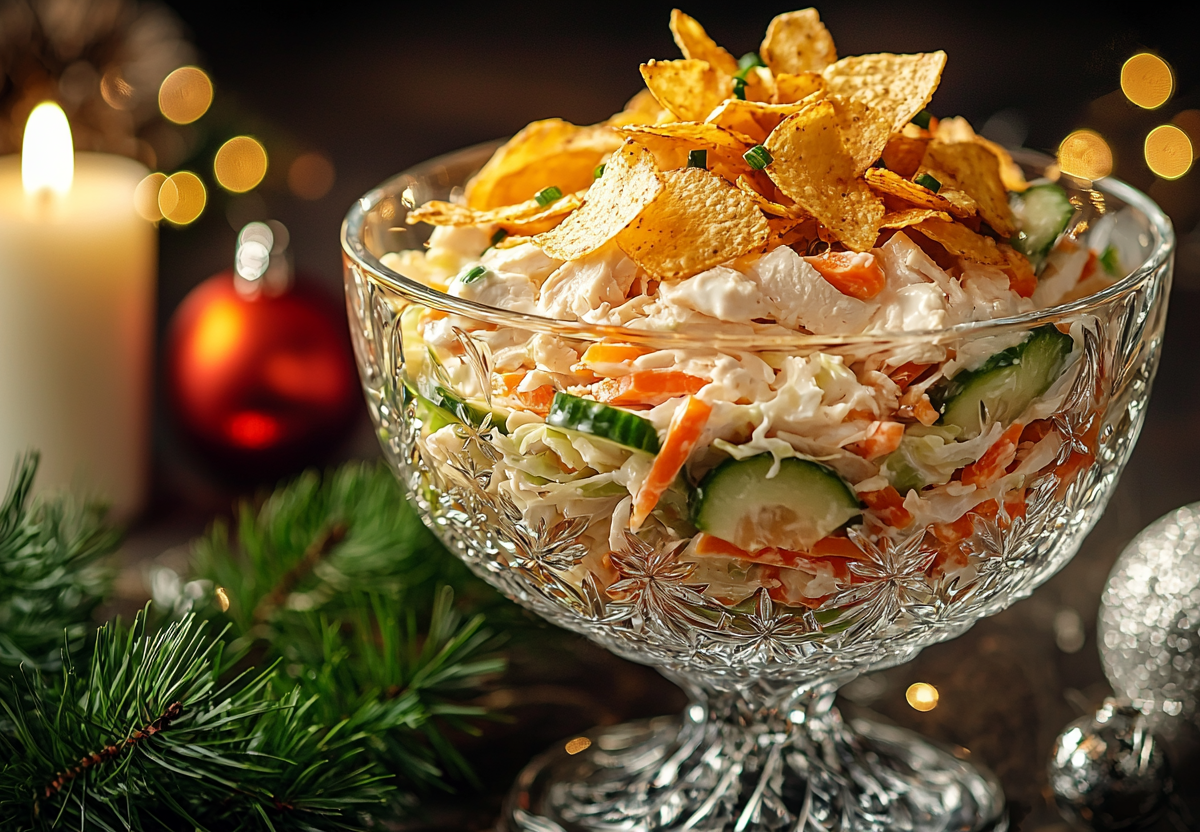 Салат «Новогодний хруст»: времени нет, а гости на пороге? Этот быстрый салат готовится из самых простых продуктов. Этот рецепт станет настоящим спасением! Он сочетает в себе свежесть овощей, сочность курицы и приятную остроту моркови по-корейски, создавая идеальный баланс вкусов. А специальная чесночная заправка и хрустящие чипсы сверху делают его по-настоящему праздничным блюдом, которое украсит ваш новогодний стол.