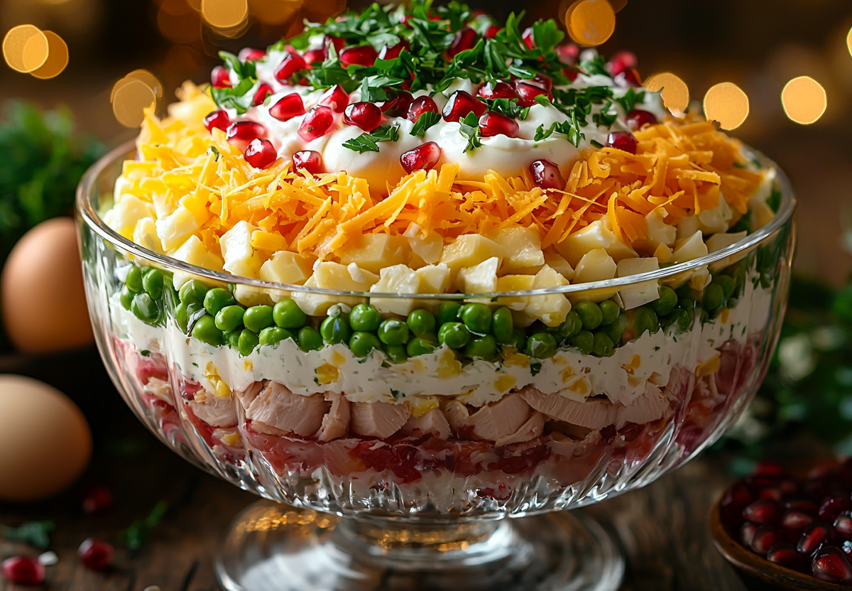 Салат «Новогодний серпантин» — с ума сойти какой вкусный: готовим праздничный стол без мороки, нервов и кучи времени. Когда хочется чего-то одновременно легкого, пикантного и по-настоящему праздничного, этот салат станет идеальным решением! Нежная копченая курочка, хрустящие огурчики и сыр создают удивительную гармонию, а аромат чеснока придает блюду особую теплоту. Такой салат не только украсит ваш стол, но и подарит ощущение настоящего зимнего праздника!