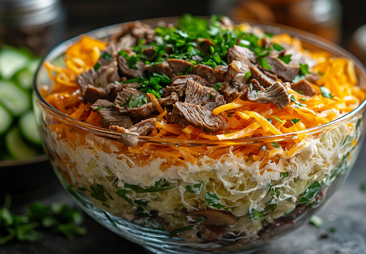 Салат «Обжорка» с говядиной и грибами: обалденное сочетание простых продуктов. Сытный и ароматный салат, который станет настоящим украшением любого стола. Идеальное сочетание нежной говядины, пикантных маринованных огурцов и золотистых грибов с луком.