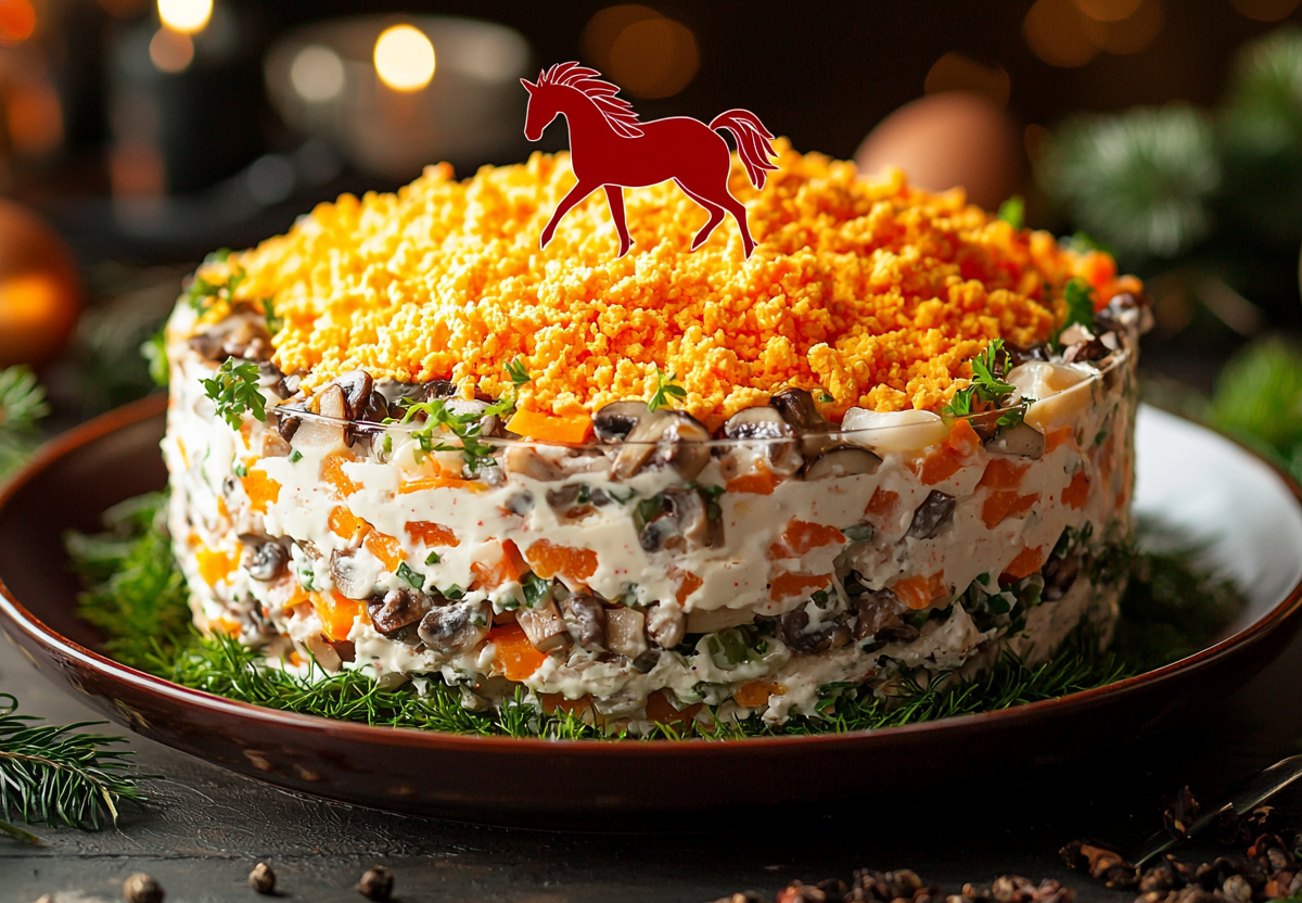 Встречайте 2026 год с тематическим салатом «Огненная лошадь», который станет главным украшением праздничного стола и вашим талисманом на удачу.