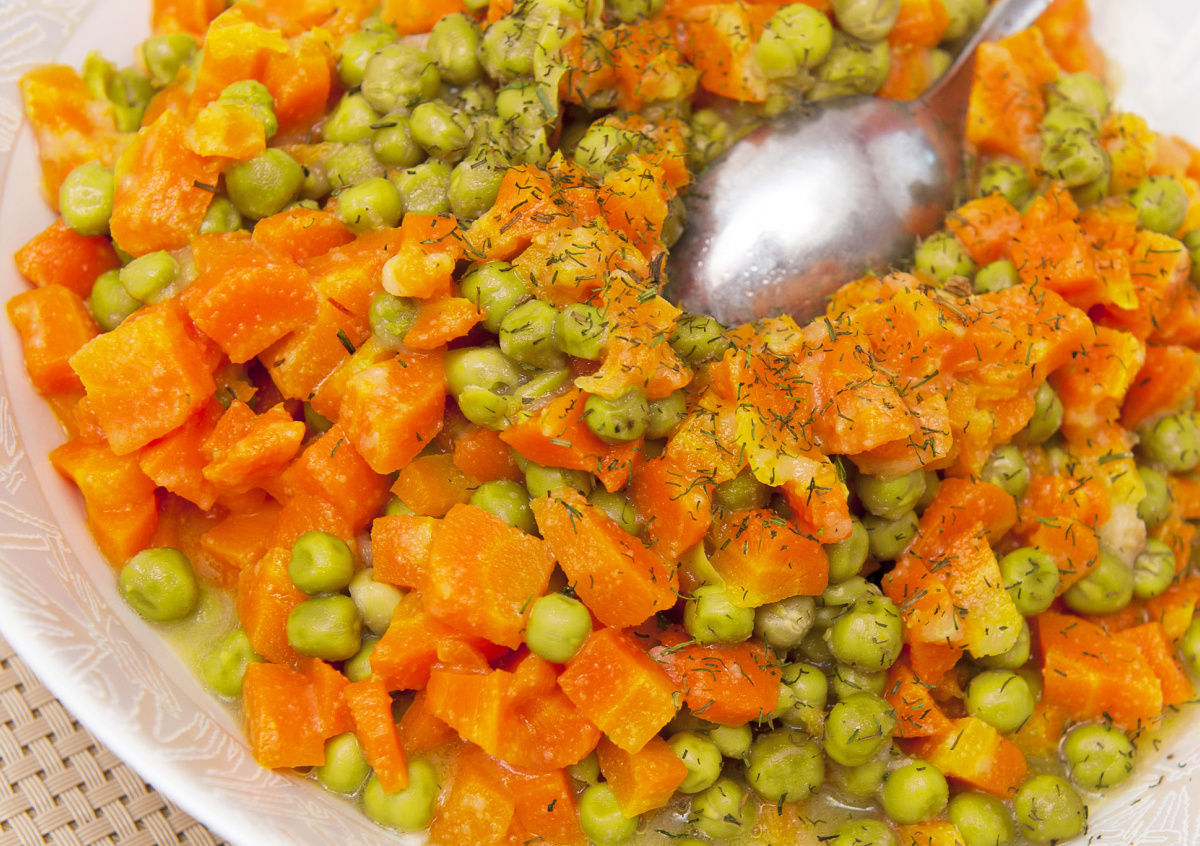 Горбушу переложить из банок в отдельную миску, вытащить кости и размять мясо вилкой до состояния фарша. Корейскую морковь порезать ножом, чтобы она не была слишком длинной. Зеленый горошек отварить до готовности в подсоленной воде. Укроп мелко нарезать. Все ингредиенты смешать в салатнике и заправить жидкостью от консервированной рыбы или соком от корейской моркови — смотря что вам больше по душе. При желании посолить и поперчить.