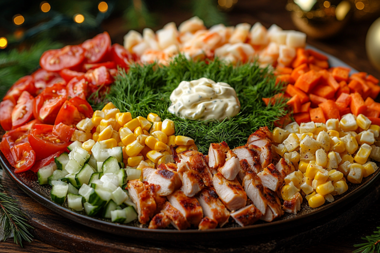 «Эдельвейс» впечатляет ярким вкусом и эффектной подачей. Дымная копчёная курица, остро-сладкая морковь по-корейски, сочный помидор, кукуруза и хрустящие сухарики создают гармоничную вкусовую композицию. Особенность — ингредиенты красиво выложены отдельными «секторами» на большом блюде, чтобы гости могли смешивать их по вкусу. Быстро, эффектно и вкусно!