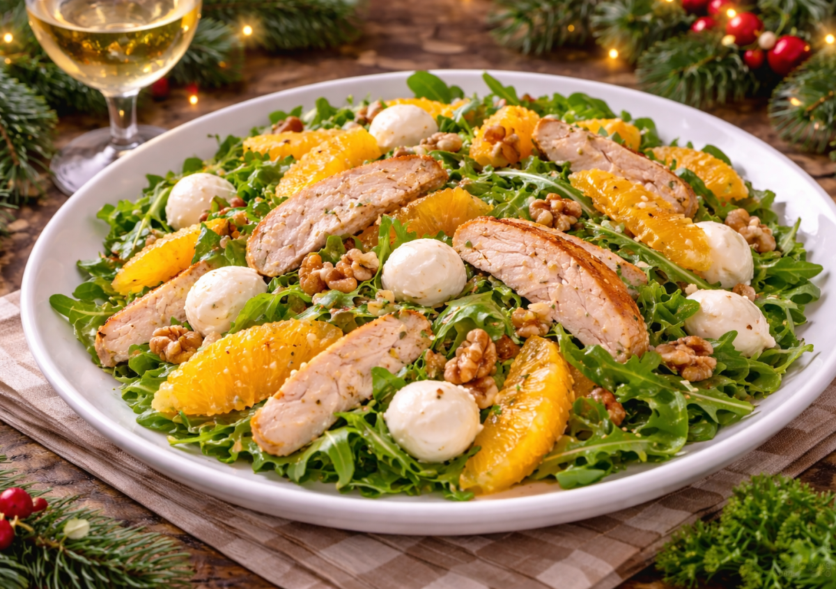 Этот салат выглядит и ощущается как блюдо из хорошего ресторана. Легкий, сочный, с яркой цитрусовой ноткой апельсина, нежной моцареллой и ароматным жареным куриным филе. Отлично подходит к вину, красиво смотрится на праздничном столе и при этом остается сбалансированным и не тяжелым.