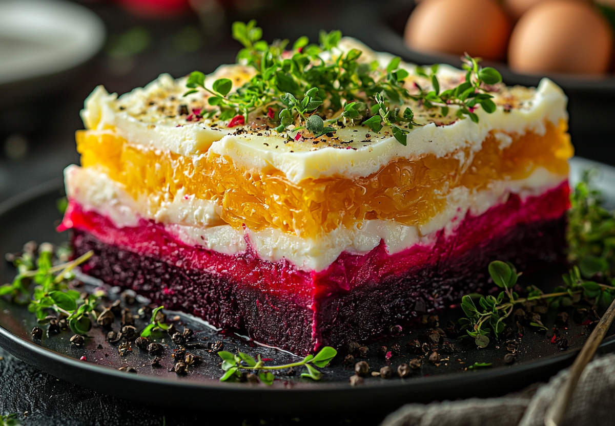 Салат «Простушка» — слоёный хит! Продукты обычные, а вкус совсем не простой. Этот яркий многослойный салат сочетает в себе сладость свеклы, пикантность маринованных огурчиков и нежность сырной прослойки. Несмотря на простоту приготовления, получается очень праздничное и сытное блюдо, которое украсит любой стол.