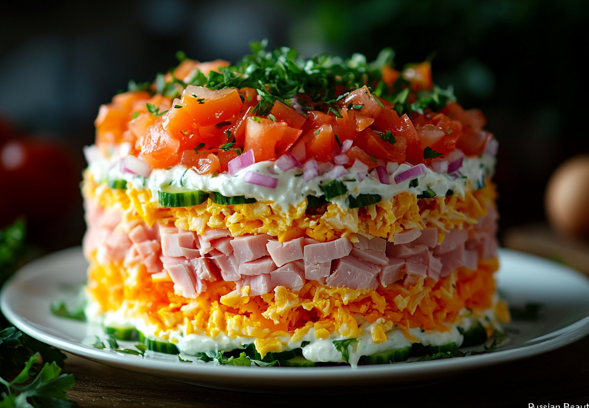 Салат «Русская красавица» готовлю на все праздники: неизбитое сочетание разлетается быстрее надоевшего оливье и крабового. Хотите приготовить салат, который станет главным украшением праздничного стола? Это блюдо поразит ваших гостей идеальным балансом вкусов и элегантным видом! Нежная куриная грудка, ароматная ветчина и хрустящие огурчики создают восхитительную гармонию, а сметанная заправка придает салату особую легкость.