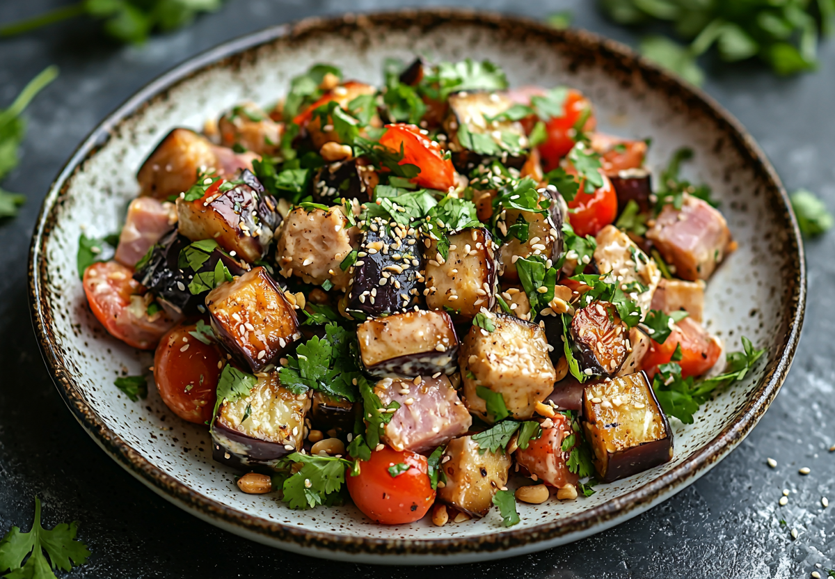 Салат с хрустящими баклажанами и ветчиной! Суперсоус из арахиса и сыра! Этот салат — настоящий фейерверк вкусов и текстур! Нежнейшая ветчина, сочные помидоры, пикантная кинза и главный герой — невероятно хрустящие кусочки баклажана, которые тают во рту. Всё это объединяет насыщенный, сливочно-ореховый соус.