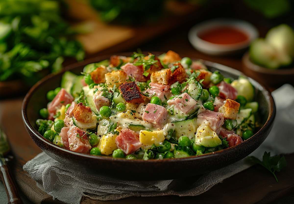 Этот салат покоряет своим насыщенным вкусом — копченая колбаса прекрасно сочетается со сладковатым горошком, а хрустящие сухарики добавляют приятную текстуру, которая контрастирует с нежностью остальных ингредиентов. Сыр придает блюду сливочную нотку, а свежий огурец — легкую свежесть.