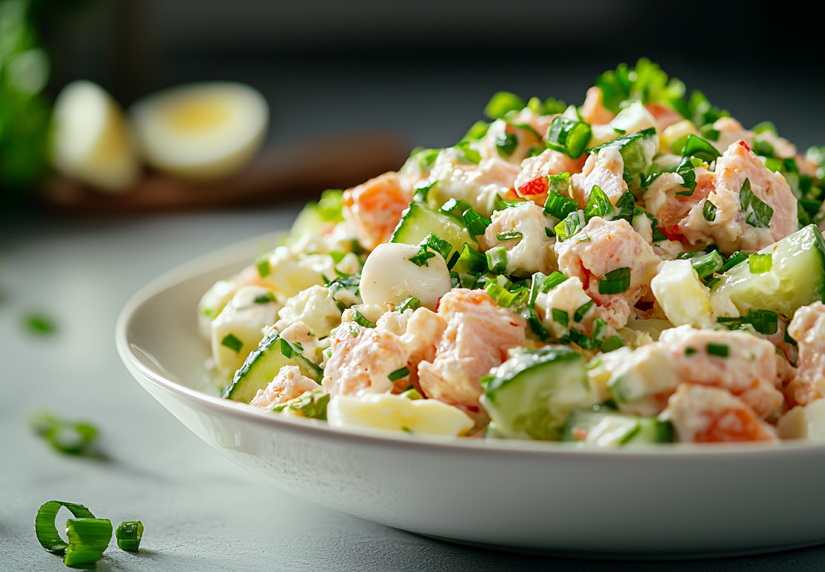 Берем: тунец консервированный — 1 банка (250 г), крабовые палочки — 200 г, яйца — 3 шт., огурцы свежие — 2 шт., зеленый лук — 2–3 пера, майонез — 3–4 ст. л., соль и перец по вкусу. Тунца разминаем вилкой, предварительно слив жидкость. Крабовые палочки режем кружочками, вареные яйца и огурцы — аккуратными кубиками. Зеленый лук шинкуем помельче.