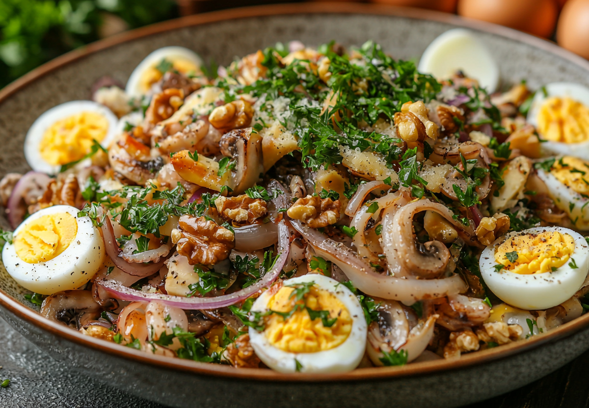 Этот пикантный салат с маринованными кальмарами готовится очень быстро, а получается очень вкусным благодаря особой заправке из орехов! Нежная текстура морепродуктов в сочетании с обжаренными грибами, сыром и грецкими орехами создает потрясающую гармонию вкусов.