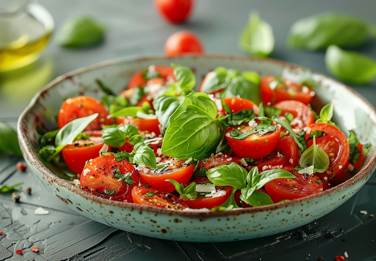 В вегетарианский сет в ресторане ПМЭФ вход салат с томатами черри и кремом из базилика. Делимся простым рецептом и рассказываем, как легко и просто приготовить подобное блюдо дома.