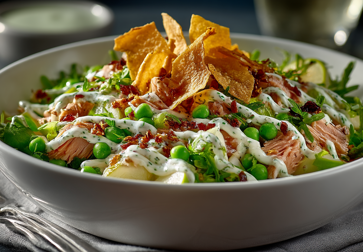 Консервированный тунец в собственном соку — 2 банки (около 200 г), замороженный зеленый горошек — 150 г, куриное яйцо — 1-2 шт. (по желанию), красный сладкий лук — 1/2 шт., маринованные корнишоны — 4-5 шт., яблоко (кисло-сладкое) — 1/2 шт., консервированная кукуруза — 3 ст. л., острые чипсы (например, со вкусом перца) — небольшая горсть, майонез — 2-3 ст. л., сок лимона — 1 ст. л., винный уксус — 1 ч. л., васаби (паста) — 1/2–1 ч. л., сироп агавы или мед — 1 ч. л., соль, свежемолотый черный перец — по вкусу.