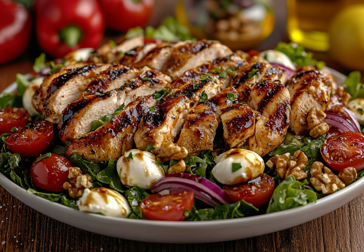3. Соберите салат. На тарелку выложите листья салата, сверху — курицу, перец, помидоры черри, моцареллу и красный лук. Посыпьте грецкими орехами. Сбрызните оливковым маслом и лимонным соком. По желанию добавьте бальзамический соус.