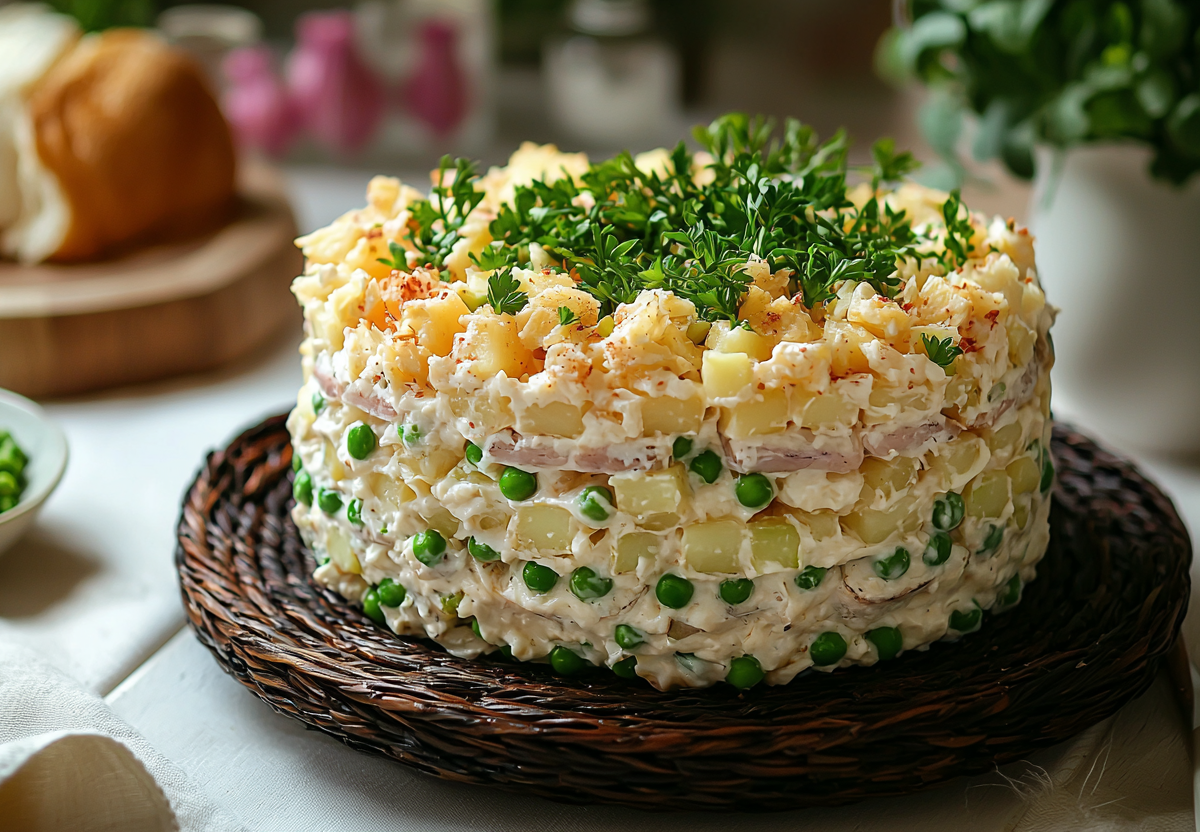 Вкус получается свежим и сбалансированным: хрустящая сочная капуста, нежная курица, сладкий горошек, сливочные ноты сыра и яиц. Сметана мягко обволакивает ингредиенты, не утяжеляя блюдо. Это вариант, когда можно съесть большую порцию, не переживая за фигуру.