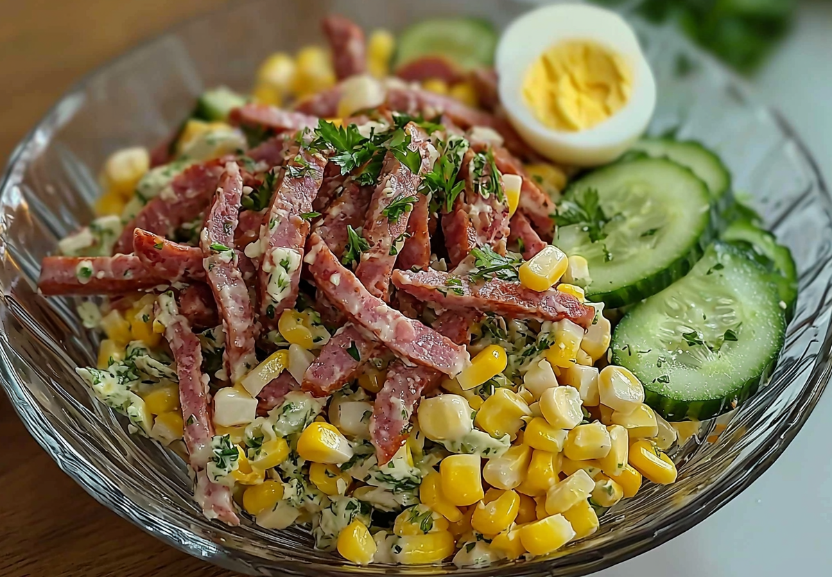 - С кукурузы слейте рассол. Яйца очистите. Огурцы вымойте и обсушите. Колбасу, яйца и огурцы нарежьте тонкой соломкой. В глубокой миске соедините все ингредиенты. Добавьте кукурузу, соль, перец — по вкусу. Заправьте майонезом, перемешайте.