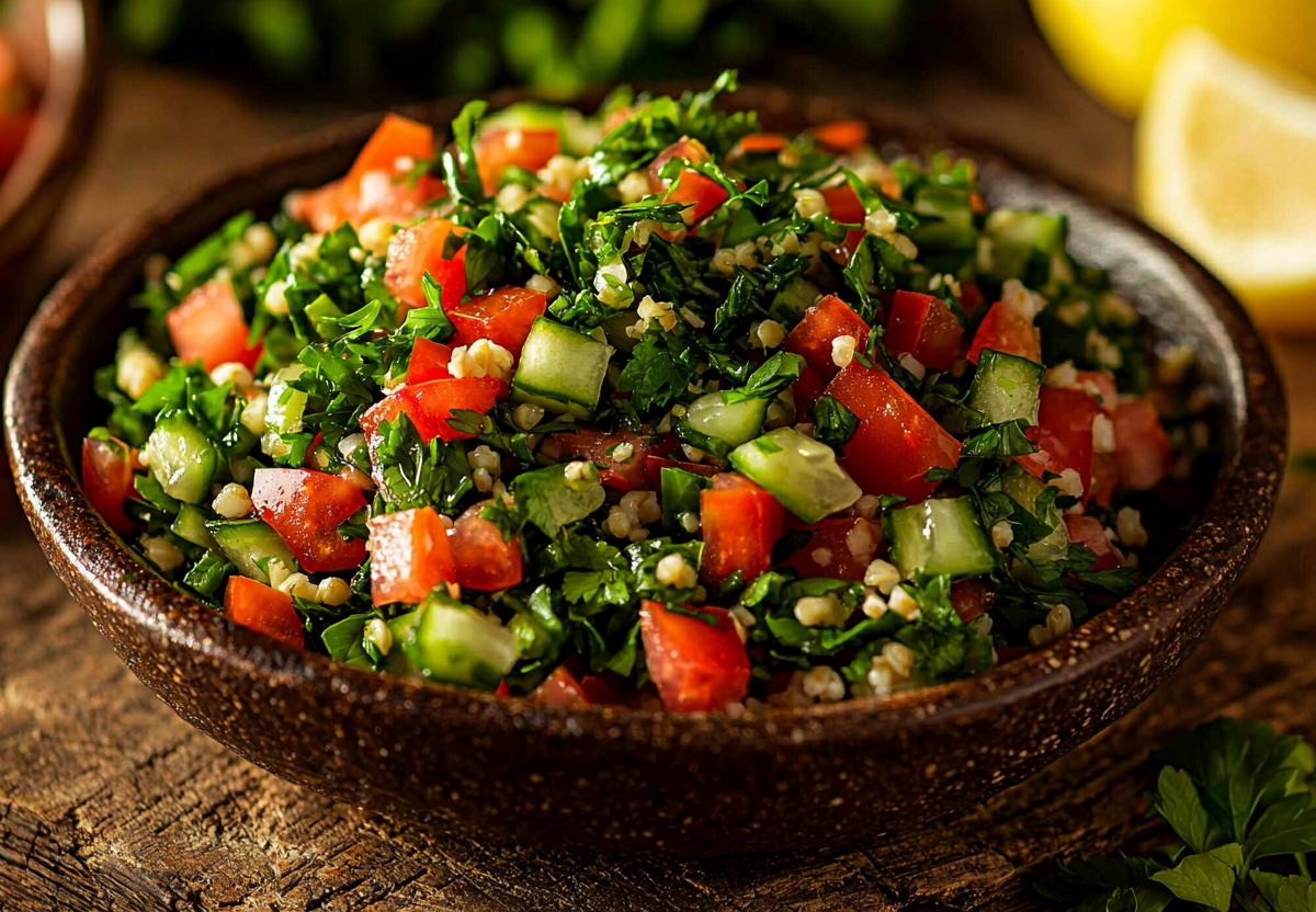 Салат «Табуле» с булгуром! Идеален летом — классика восточной кухни. Это сочетание полезного булгура, сочных овощей и ароматной зелени делает этот салат любимцем поклонников здорового питания. Благодаря лимонно-оливковой заправке блюдо получается легким, но сытным, с ярким свежим вкусом. Такой салат хорош как самостоятельное блюдо на перекус или как гарнир к мясу.