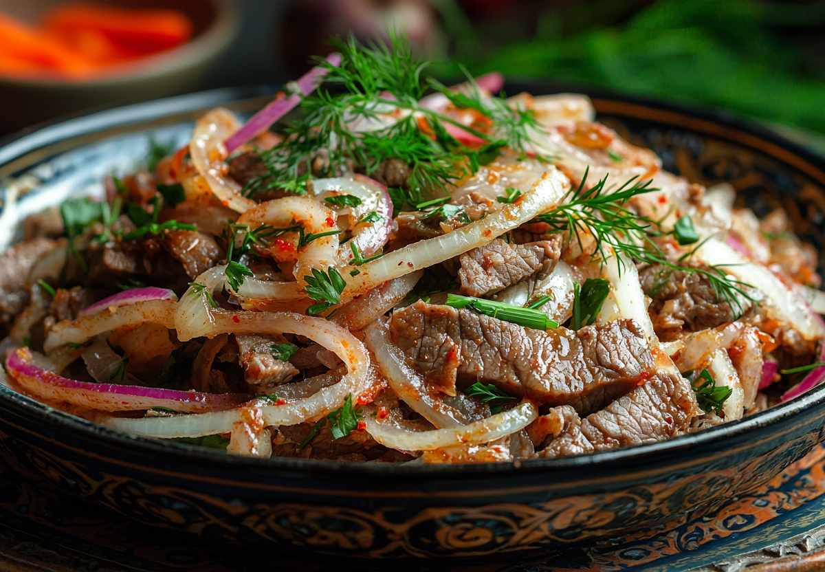 Салат «Ташкент» из говядины и дайкона! Классика с восточным акцентом. Это сочетание сочного мяса, нежной редьки и мягкого лука в пикантной заправке делает его лёгким, но сытным. Идеальный вариант для тех, кто любит необычные вкусы без лишних сложностей.
