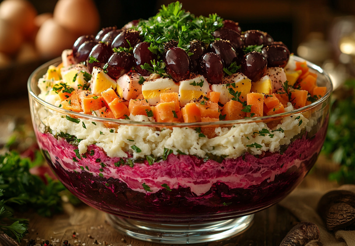 Салат «Темный граф» — королевское украшение стола! Обалденно вкусный. Изысканное сочетание мяса, овощей и грибов под майонезной вуалью. Этот многослойный салат с эффектным виноградным декором станет главным хитом стола. Сочные ингредиенты, нежная текстура и презентабельный вид покорят даже самых требовательных гурманов!
