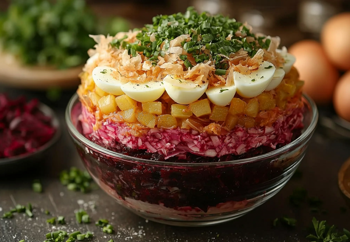 2. Сборка слоев. Выкладывайте ингредиенты в прозрачный салатник или на плоскую тарелку в таком порядке: 1. Картофель → слегка посолите + смажьте майонезом. 2. Лук (равномерно распределите). 3. Соленые огурцы. 4. Шпроты + майонез. 5. Яйца + немного майонеза. 6. Свекла (аккуратно разровняйте, смажьте майонезом).