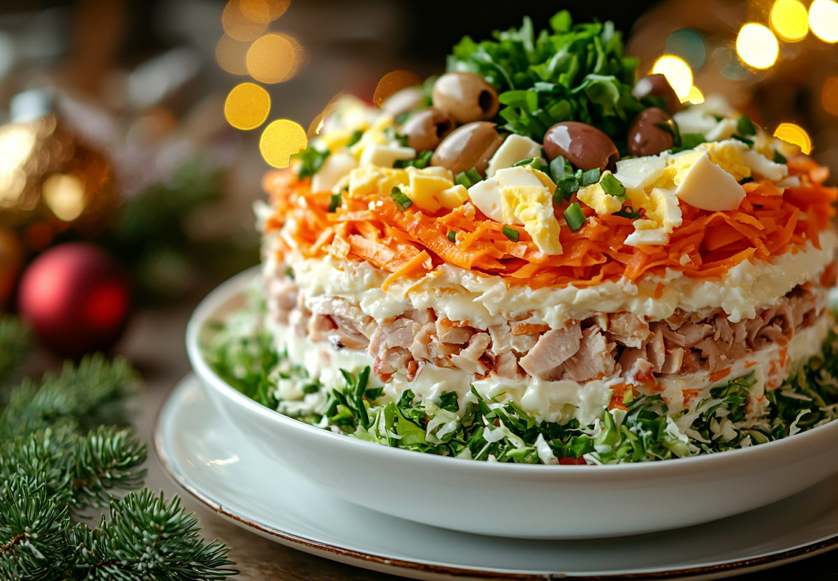 Ингредиенты: копченый куриный окорочок (1 шт.), морковь по-корейски (180 г), салат айсберг или пекинская капуста (150 г), яйца (4 шт.), твердый сыр (150 г), зеленый лук, маслины без косточек, майонез.