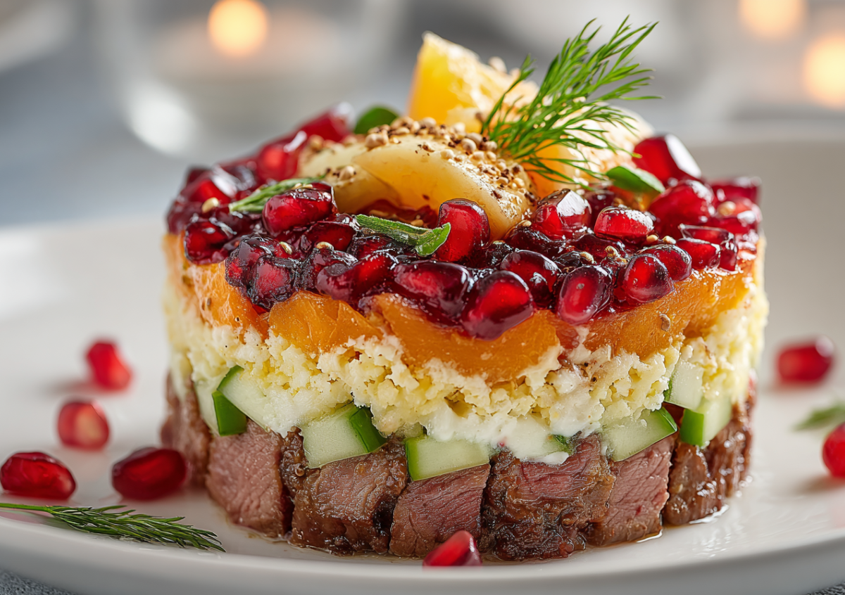 Этот салат — воплощение изысканности и благородства на вашем праздничном столе. Нежный отварной язык, рубиновые зерна граната, свежий огурец и классическое сочетание яиц с сыром создают многослойную композицию утонченных вкусов и текстур. Это блюдо не просто заменяет традиционные салаты — оно задает новый стандарт праздничного угощения, где каждый ингредиент подобен драгоценности в королевской оправе.
