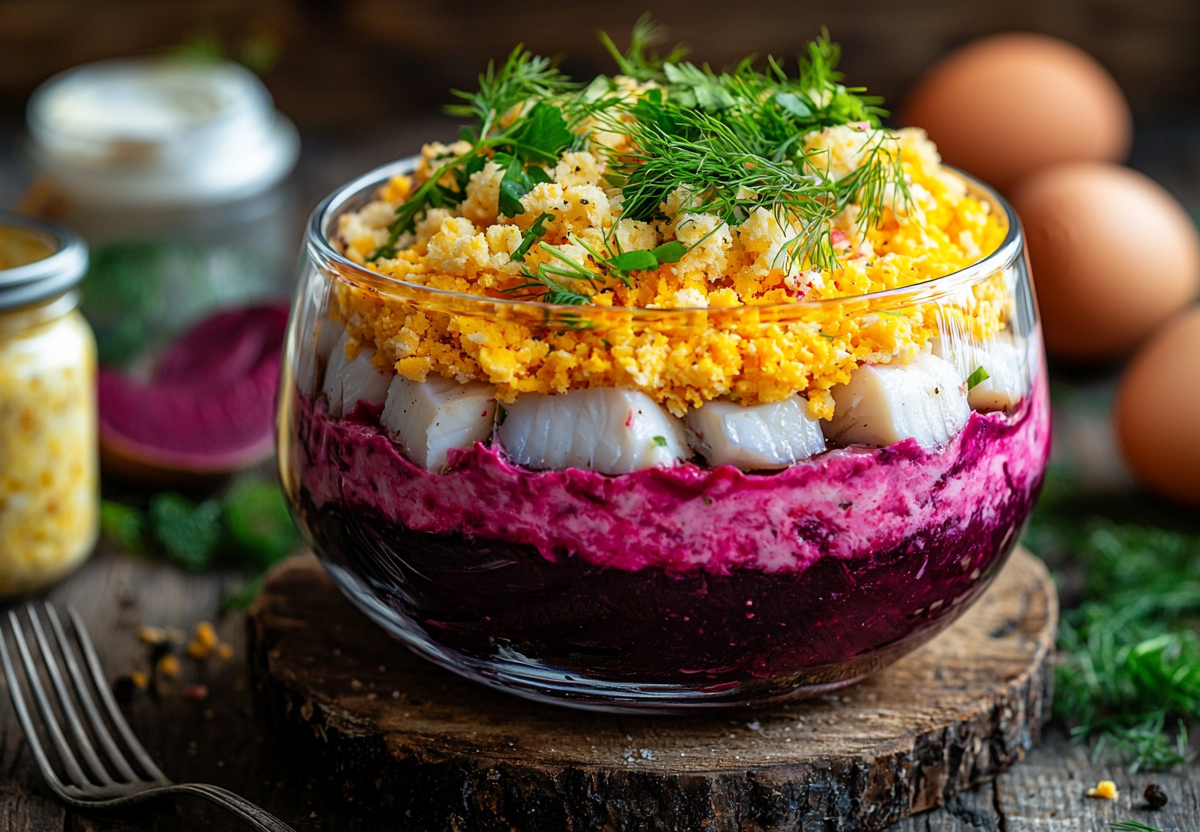 Салат «Яркий» со свеклой, сайрой и яйцами! Два прихлопа — и готово! Этот слоёный салат сочетает сладость свеклы, пикантность солёных огурцов и насыщенный вкус консервированной сайры. Идеально подходит для праздничного стола — красиво, сытно и просто!