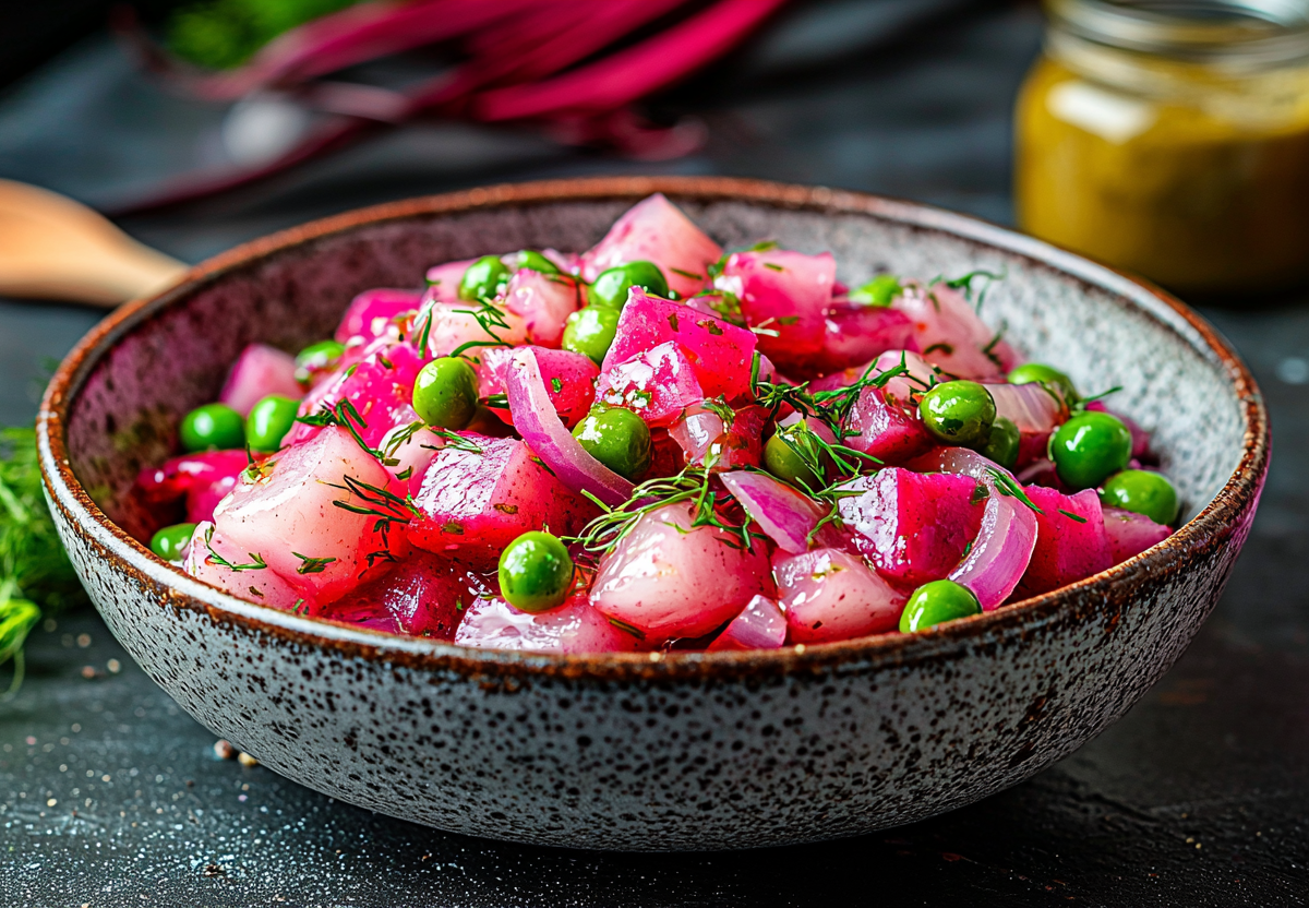 3. В глубокой салатнице аккуратно соедините нарезанное филе сельди, свеклу, консервированный горошек и подготовленный лук. Полейте салат приготовленной заправкой, приправьте солью и перцем по вкусу.