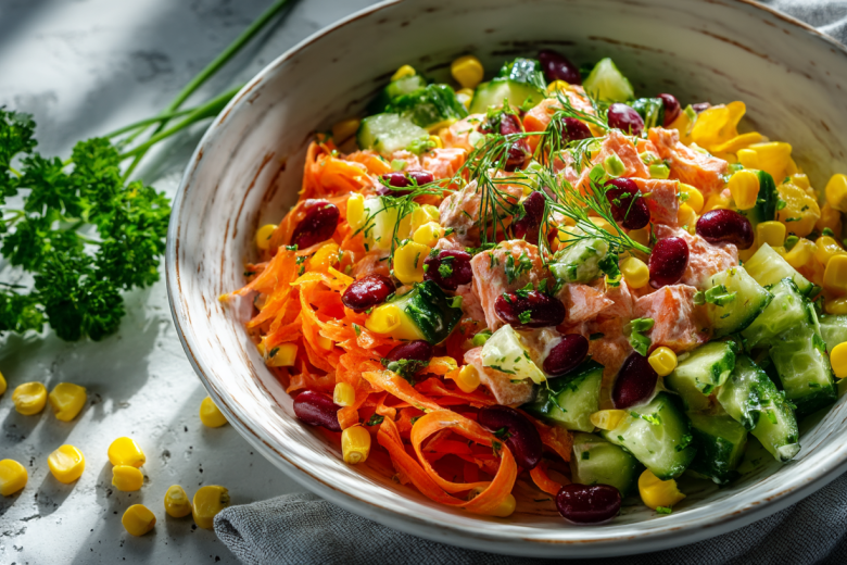 Этот салат спасет любой обед или ужин: готовится буквально за 5 минут, при этом получается ярким, сытным и необычайно вкусным. Не нужно варить кучу ингредиентов — достаточно минимального набора продуктов, а результат удивит всю семью. Главное — съедается он мгновенно!