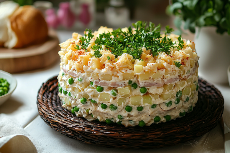 Вкус этого салата — это гармоничное сочетание нежной картофельной основы, пикантной селедки, хрустящих соленых огурцов и сливочных ноток плавленого сыра. Яйца и горошек добавляют нежности и свежести, а майонез объединяет все слои в единую композицию.