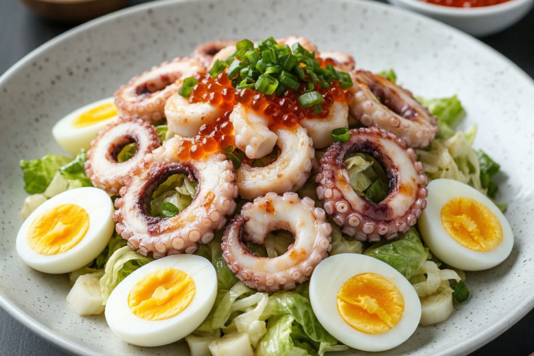 Этот салат впечатляет идеальным балансом текстур: упругая пекинская капуста создает свежий хруст, нежные кальмары тают во рту, а яйцо и икра добавляют сочные и пикантные нотки. Легкая заправка на основе лимонного сока и масла подчеркивает натуральный вкус морепродуктов, делая блюдо освежающим и по-настоящему праздничным.