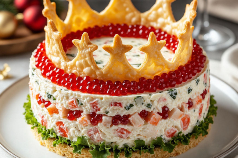 Этот салат станет истинным украшением вашего праздничного стола, поражая гостей царской роскошью и изысканным исполнением. Нежная основа из крабового мяса и овощей, обрамленная золотистой короной из запеченного сыра, создает потрясающий визуальный эффект. А алые гроздья икры на вершине подобны драгоценным рубинам, завершая образ поистине королевского угощения, которое готовится удивительно просто.