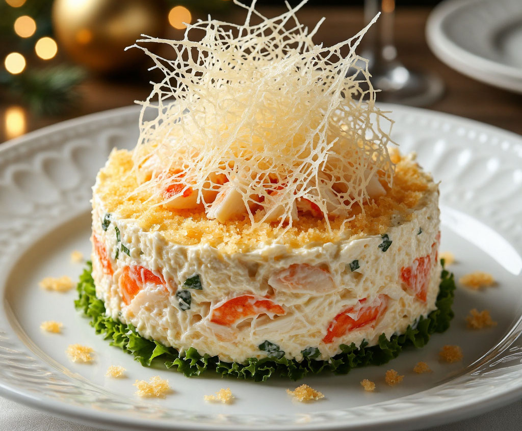 Этот салат — синоним праздничной роскоши и кулинарного мастерства. Он сочетает нежную сладость крабового мяса с пикантным, солоноватым вкусом хрустящей пармезановой «вуали». Золотистая, ажурная сеточка сыра не только создает потрясающий визуальный эффект, но и добавляет изысканный текстурный контраст сочной, сливочной начинке. Это блюдо, которое безусловно станет центром внимания и предметом восхищения ваших гостей в новогоднюю ночь.