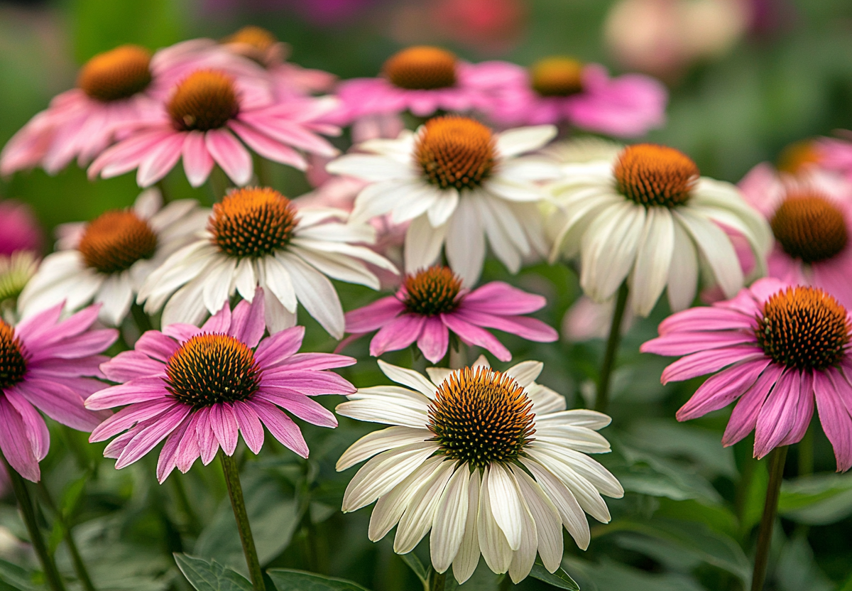 Эхинацея — этот цветок выдерживает засуху, морозы до -40°C, растет на любых почвах (даже на бедных и каменистых) и не требует подкормок. Достаточно посадить его весной или осенью на хорошо освещенном месте, заглубив корневую шейку на 2-3 см, и забыть о существовании — эхинацея самостоятельно подавит сорняки мощной корневой системой, привлечет бабочек и пчел своими яркими «ромашками» и будет десятилетиями украшать сад розовыми, малиновыми или белыми соцветиями.