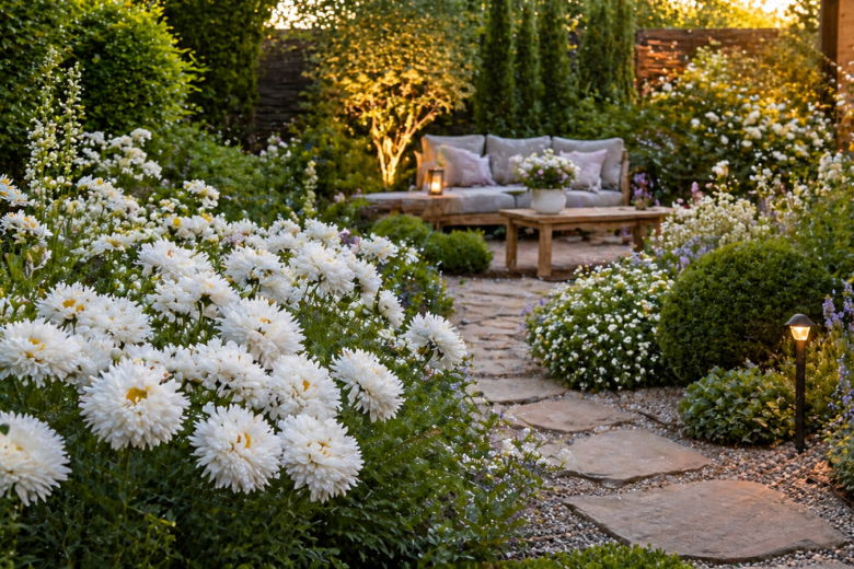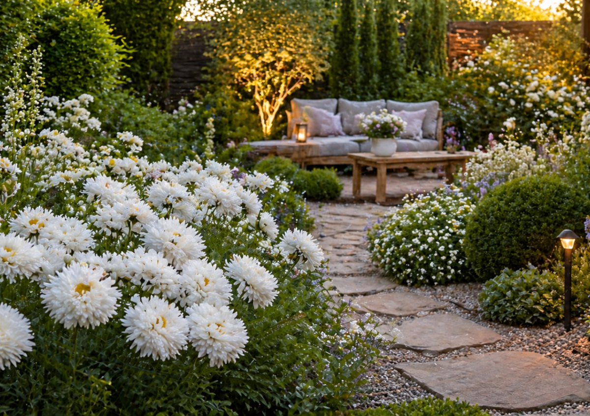 Беру проверенный нивяник «Крейзи Дейзи» — и клумба сразу оживает. Это не та простая ромашка, к которой все привыкли: лепестки будто взъерошены, цветы махровые, объёмные и очень живые на вид. Получается обалденная красота: белые соцветия с мягкой «лохматой» текстурой смотрятся дорого и необычно, особенно в массе посадок.
