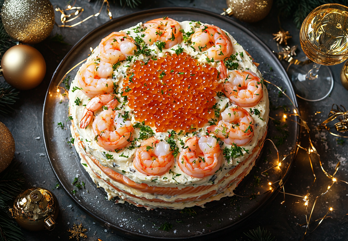Вам понадобится: 2 отварные картофелины, 2 яйца вкрутую, 150 г слабосоленой красной рыбы (семга, форель), 1 свежий огурец, 150 г отварных очищенных креветок, 2 плавленых сырка, майонез. На большое плоское блюдо выложите первый слой из тертого отварного картофеля и слегка смажьте его майонезом. Вторым слоем распределите тертые яйца — их не смазывайте. Третьим слоем — нарезанную кубиками красную рыбу, четвертым — соломку огурца. Этот овощной слой немного смажьте. Пятый слой — целые или половинки креветок, их тоже не смазывайте. Завершающим, шестым слоем обильно покройте салат мелко тертым плавленым сырком, создавая эффект снежной шапки. Перед подачей дайте настояться в холодильнике 1–2 часа.