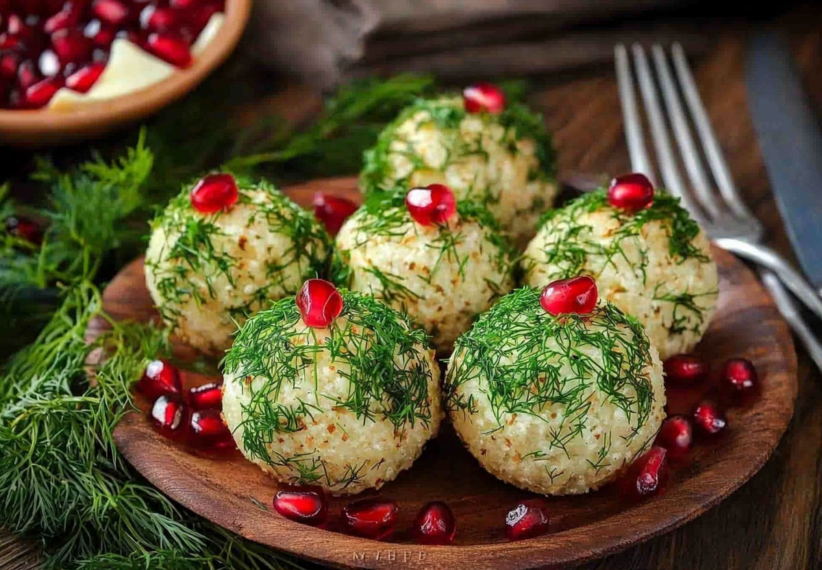 Выложите шарики на большое праздничное блюдо, украсив его лентами, чтобы закуска напоминала настоящие елочные игрушки.