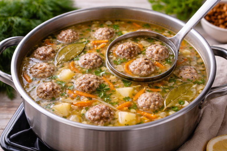 Этот суп я готовлю чаще всего, потому что он простой, сытный и всегда получается удачным. Но есть несколько хитростей, которые делают его особенно вкусным: бульон остается прозрачным из-за обжарки, фрикадельки — сочными из-за манки, а сам суп — нежным и ароматным из-за лимона.