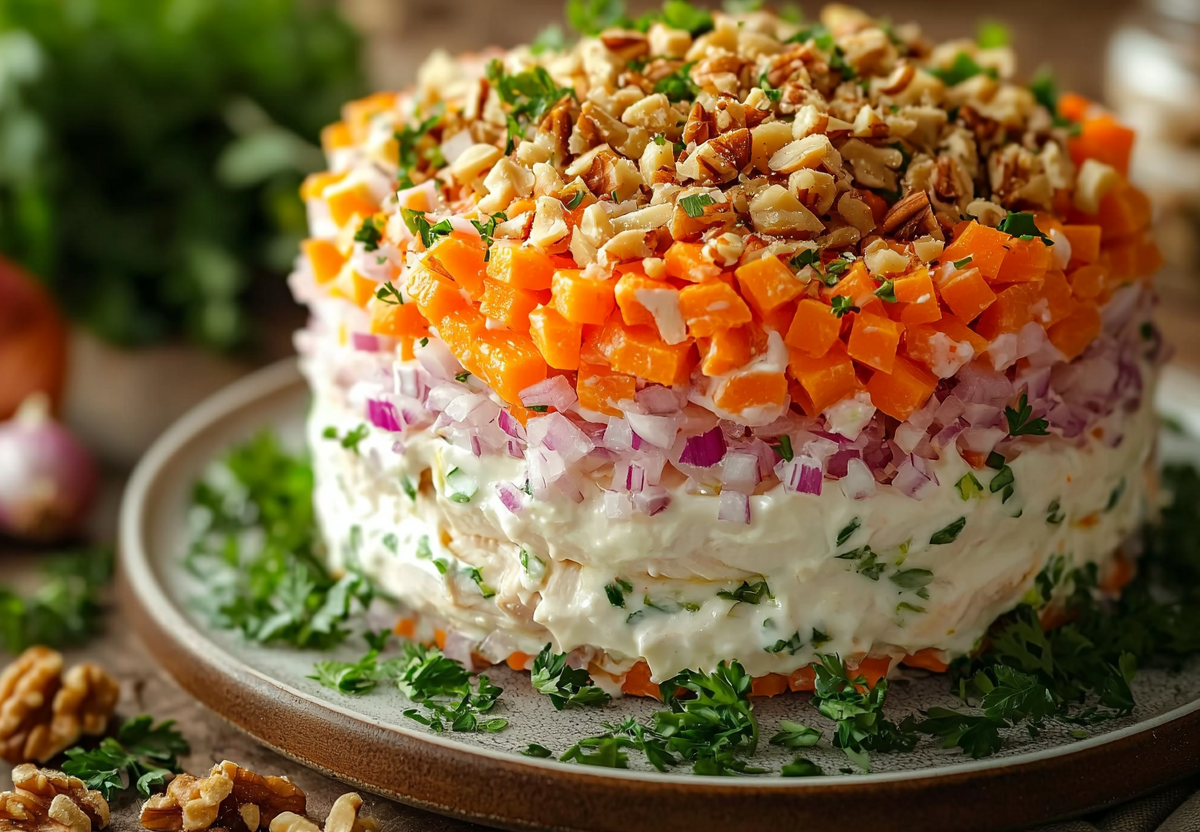 Натрите отваренную морковь и выложите следующий слой. Снимите кольцо, смажьте салат со всех сторон майонезом, посыпьте тертым сыром и ореховой крошкой, поделилась повар Юлия Архипова с «Белновостями».