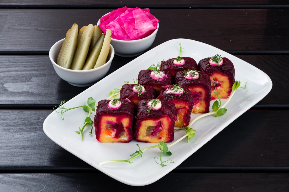 Этот рецепт превращает знакомую всем шубу в изысканную закуску! Свекольные блинчики не только делают рулеты красивыми, но и усиливают вкус свеклы в салате. Идеальное решение, когда хочется удивить гостей новой подачей классического блюда.