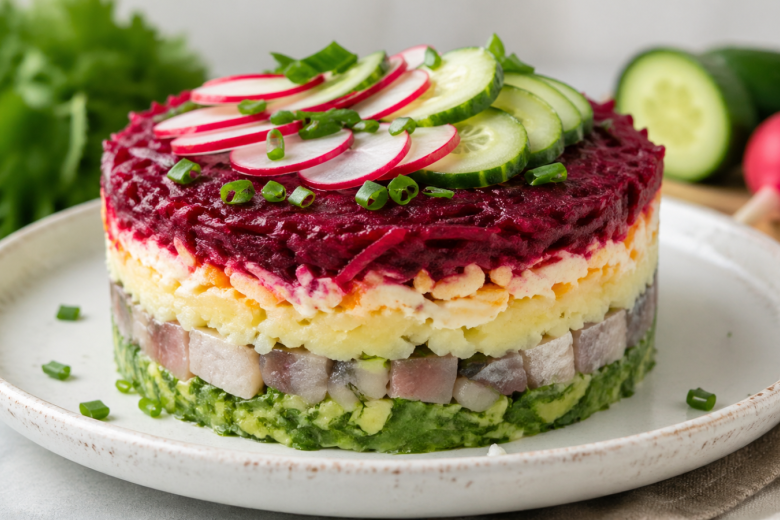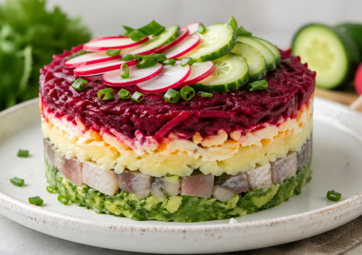 Классическая селедка под шубой хороша зимой, но весной хочется чего-то легче и свежее. В этом варианте остается любимое сочетание продуктов, но вместо тяжелого майонеза — легкий соус и зеленые слои, которые делают вкус ярче и современнее.