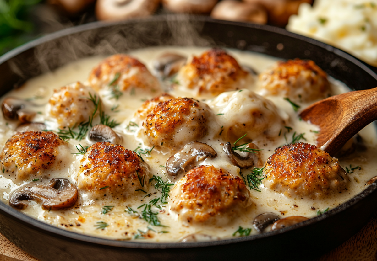 Семья забыла о котлетах! Требует куриные митболы в сливочно-грибном соусе! Это блюдо станет настоящей звездой вашего ужина — сочные куриные шарики в ароматном грибном соусе с нотками сливок и соевого соуса. Идеально сочетается с картофельным пюре или пастой!