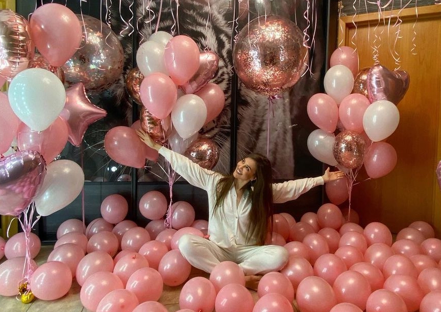 На снимке видно, что всё пространство комнаты заполнено белыми и розовыми шарами. В сторис она также продемонстрировала все подарки, которые ей подарили близкие и родные люди к возвращению.