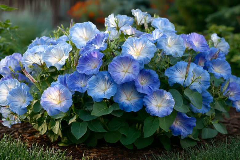 Особого внимания заслуживает его внешний вид: кустики высотой 20–50 см образуют густоветвистые куртины до 50 см в диаметре, сплошь усыпанные яркими воронковидными цветками-граммофончиками. Палитра оттенков разнообразна: белые, розовые, голубые, пурпурные, лавандовые и даже трехцветные сорта — каждый цветок живет всего один день, но на смену ему тут же распускаются десятки новых, обеспечивая непрерывное цветение с июля до заморозков.