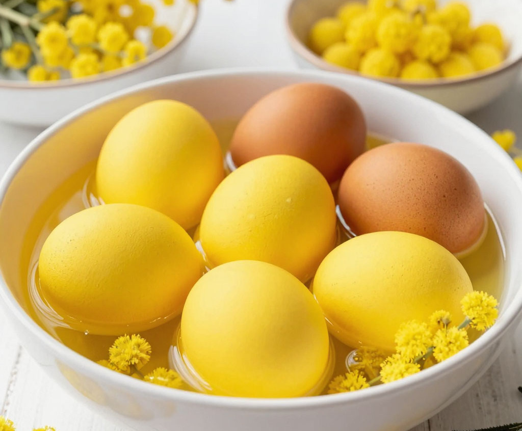 Для приготовления вам понадобится: 10 вареных яиц, 1 литр воды, 3 столовые ложки куркумы, 1 столовая ложка уксуса (для закрепления цвета). В кастрюлю налейте воду, добавьте куркуму и уксус, доведите до кипения. В кипящий раствор аккуратно опустите яйца и варите на медленном огне 10–15 минут до желаемого оттенка. Чем дольше держите, тем насыщеннее цвет. Затем выключите огонь и оставьте яйца в растворе до полного остывания, чтобы цвет закрепился. Для глянцевого блеска готовые яйца можно смазать растительным маслом.