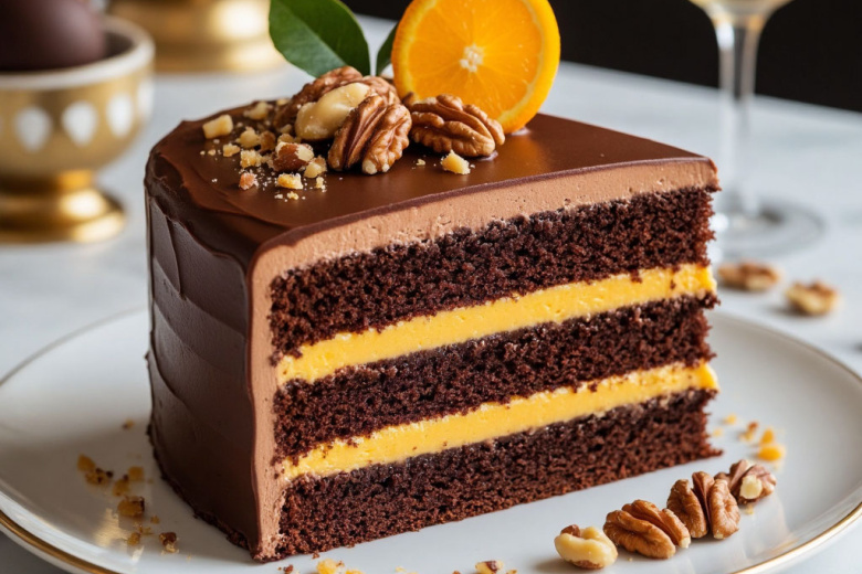 Торт «Королевский каприз» — это элегантная классика, которая впечатлит своим изысканным вкусом. Сочетание горького шоколада, ароматного апельсинового курда и хрустящего орехового пралине создает неповторимое гастрономическое удовольствие. Такой торт станет настоящим украшением праздничного стола.