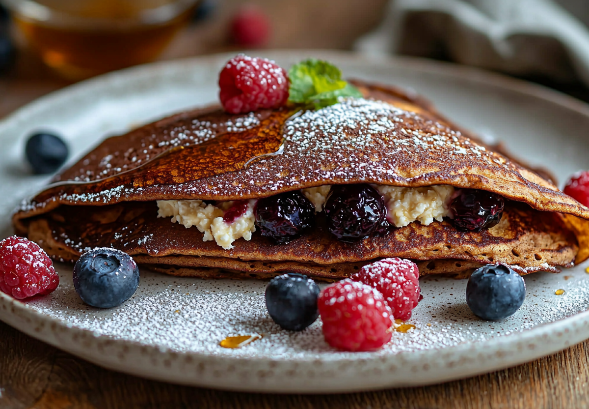- Готовый блин смажьте творожной массой, добавьте ягоды и сложите пополам. Подавайте сразу — ароматный, нежный и полезный завтрак готов!
