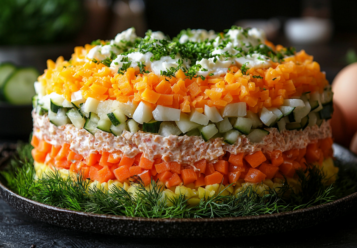 4. Подача: Дайте салату настояться в холодильнике 1–2 часа, чтобы слои пропитались.
