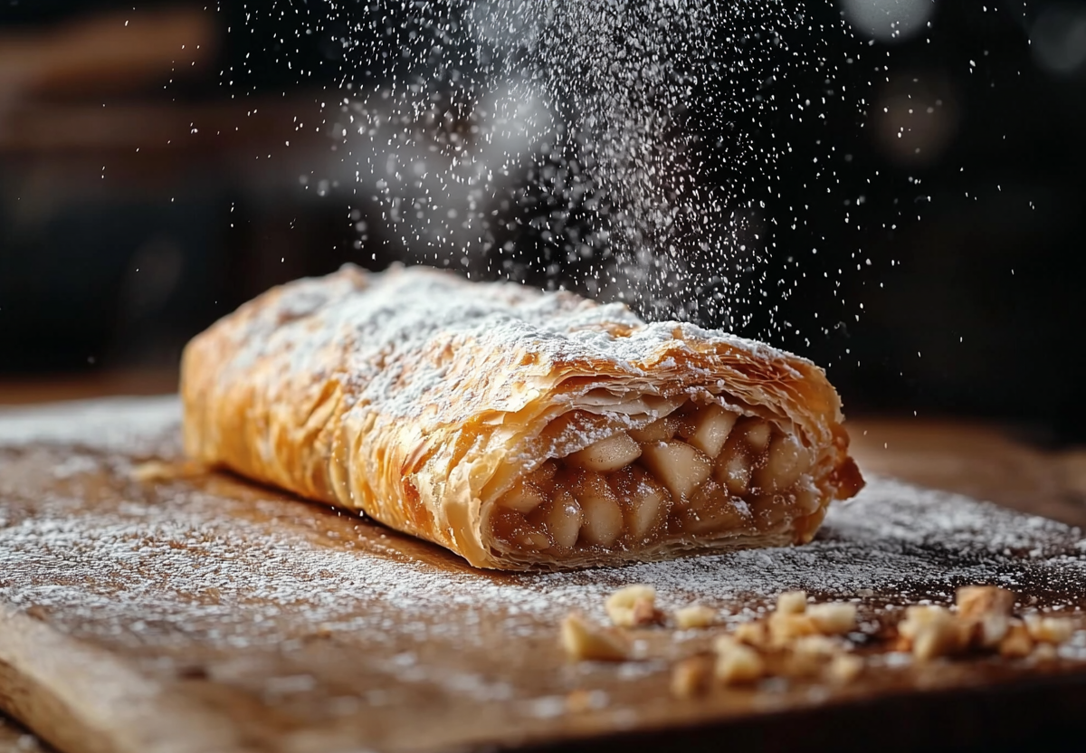 Выпекайте 15 минут при 190°C до золотисто-хрустящей корочки. Пока штрудель теплый, посыпьте сахарной пудрой. Эта хрустящая вкуснятина не уступит ресторанным десертам, но готовится в разы быстрее!