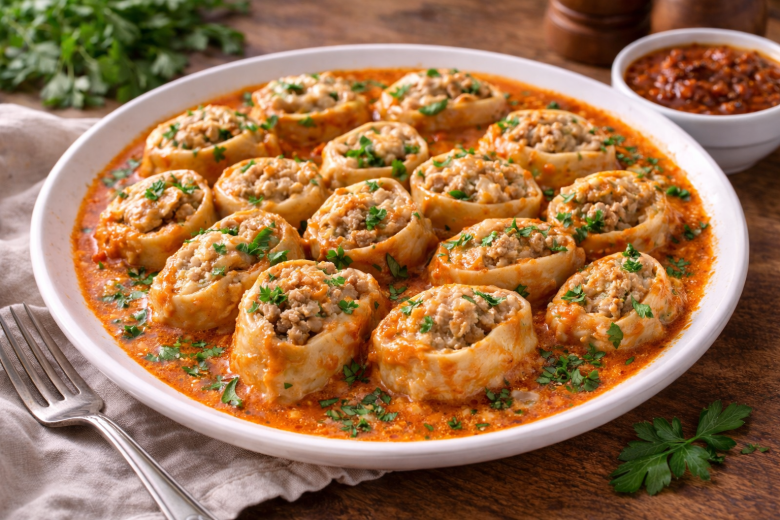 Если любите пельмени, но не хотите часами их лепить — этот рецепт для вас. Штрумбы называют «ленивыми пельмешками»: все просто, быстро и невероятно вкусно. Сочные рулетики с мясной начинкой тушатся в ароматном соусе и получаются мягкими, сытными и очень домашними. Готовлю их, когда нужно накормить семью без лишней возни, — съедаются всегда до последнего кусочка, особенно с острым соусом.