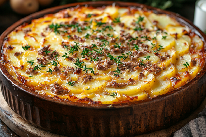 Для приготовления вам понадобится: 1 кг картофеля, 500 г мясного фарша, 2 луковицы, 2 яйца, 100 мл молока, 100 г твердого сыра, 3 ст. л. сметаны, соль, перец, растительное масло. Картофель отварите в мундире, очистите и нарежьте тонкими кружками. Лук мелко нарежьте и обжарьте до золотистого цвета, добавьте фарш и готовьте 10 минут, посолите и поперчите. Форму для запекания смажьте маслом. Выложите половину картофеля, распределите фарш, накройте оставшимся картофелем. Смешайте яйца со сметаной и молоком, залейте торт. Посыпьте тертым сыром. Запекайте 30–35 минут при 190 °C до румяной корочки. Дайте настояться 10 минут перед подачей.